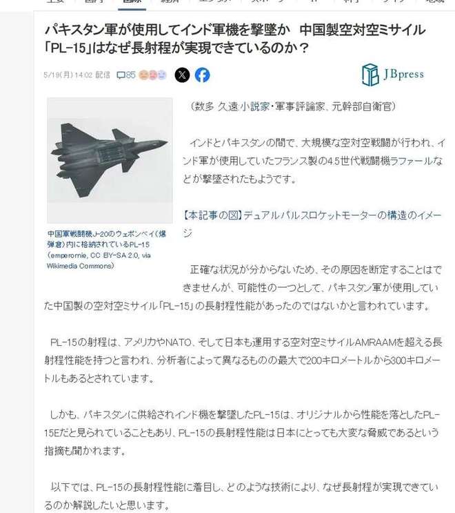 刚刚过去不久的印巴冲突,让全世界都认识到了中国武器的强大,这既引起了某些国家的敬畏和羡慕,也激起了有一些国家的嫉妒和担心。比如日本自卫队的军官山本一郎就撰文“痛批”,宣称“中国军工的射程标注是21世纪最大的军事欺诈”,矛头直指中国霹雳-15E空空导弹,说它的射程反向虚标是“欺诈”。