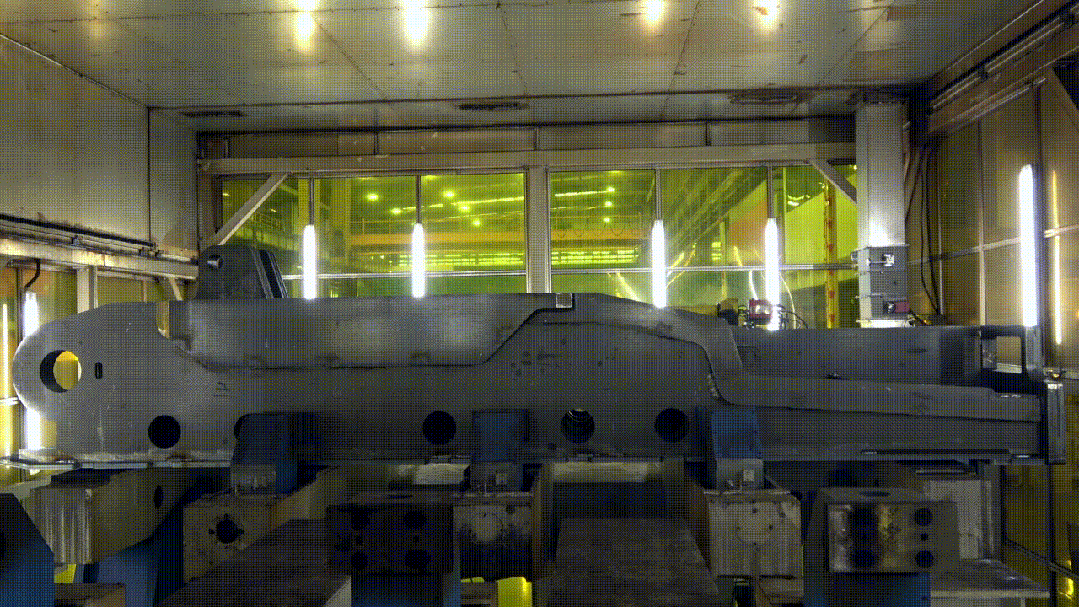因为结构复杂,原来是人工爬到工件上,蹲着甚至趴着去焊。到后来机器人平位置焊接,人工辅助吊装翻转。再到现在,独家创造的抓手式无人智能行车,代替了需要两三个人才能完成的起吊作业;业内首次应用的大型变位机,让重达数吨的“霸王龙”也能180°自由翻转,“无死角”焊接;再加上单点除尘+整体新风模式,使得该作业区环境相较传统工厂有了本质提升。