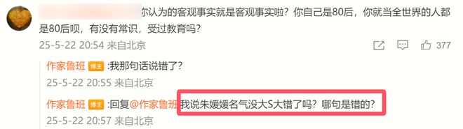 在评论区,作家鲁班继续硬刚网友,拒不认错,态度十分强硬。5月23日的时候,作家鲁班又发表了一篇文章继续为大S发声,文中也再次提及了朱媛媛,同样未觉得自己有错。