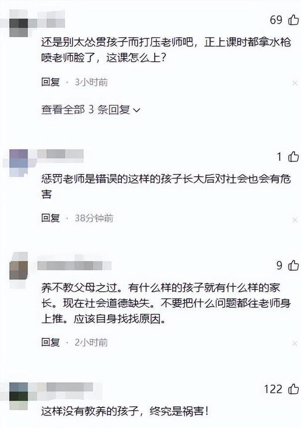 据透露,小陈之所以遭到林老师的惩戒,是因为他没有得到糖果,心生不满,在课堂上用水枪对着林老师的脸喷水,这才惹怒了林老师。