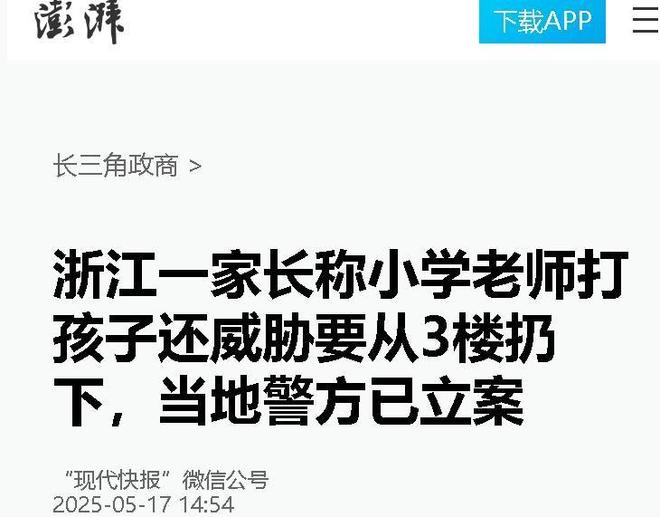 现代快报 2025 05 17 浙江一家长称小学老师打孩子还威胁要从3楼扔下,当地警方已立案现代快报抖音账号 2025 05 17 被指殴打男孩当事老师回应